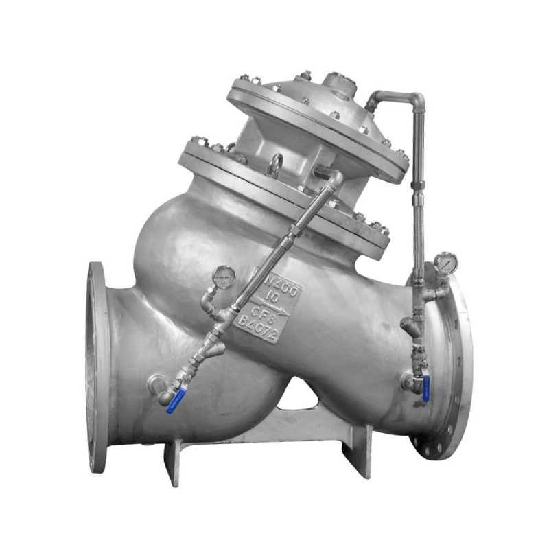 本閥具有緩開、緩閉消水錘、止回功能,可以取代止回閥、電動閥和水錘吸納器。一般安裝在水泵出口處。依靠導閥的作用,在水泵開啟時緩慢開啟;在運行過程中因介質壓力作用,閥門全開,控制腔與大氣接通,接近零水損;在水泵停止時,緩慢關閉,防止水錘噪音等并止回。多功能止回閥主要由主閥、導閥、過濾器、球閥等組成。