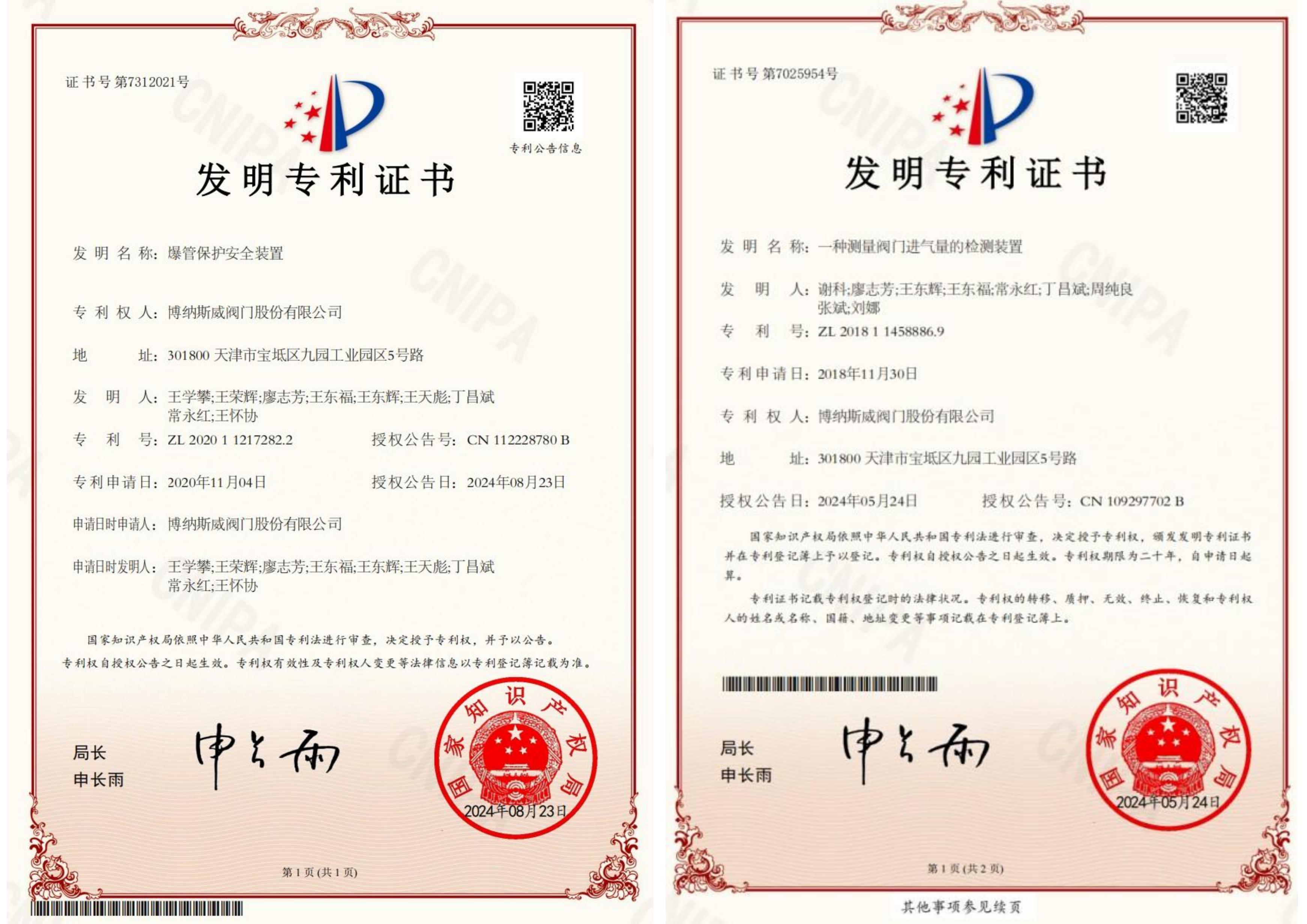 博納斯威智慧輸水系統-數字孿生平臺、博納斯威智慧輸水系統、博納斯威智慧輸水系統-水錘監測平臺、空氣閥智能監控系統、智能調節閥控制系統五項新技術獲得了國家版權局授權軟件著作權。六項發明專利包括一種用于測量閥門進氣量的檢測裝置、一種排氣閥的檢測裝置、對沖消能軸流式環塞閥、一種液壓傳動雙向密封軸流式截止閥、管道安全控制用雙速油缸以及爆管保護安全裝置。